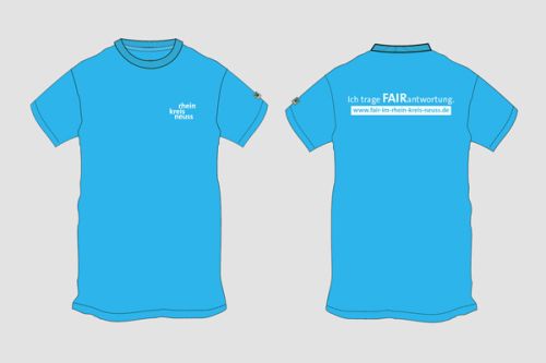 Türkisfarbenes T-Shirt für Erwachsene aus 100 % Baumwolle mit kleinem weißem Schriftzug "rhein kreis neuss" auf der Vorderseite und einem Emblem des Fairtrade-Siegels auf dem linken Arm. Auf dem Rücken ist folgender Slogan abgedruckt: "Ich trage FAIRantwortung. www.fair-im-rhein-kreis-neuss.de".